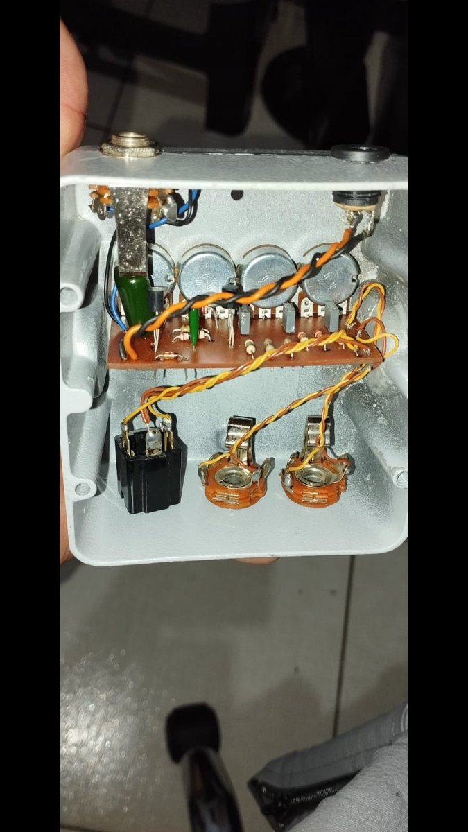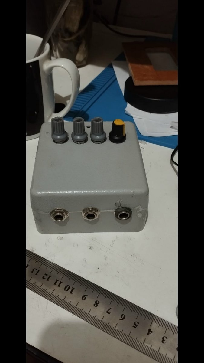 O circuito em questão ser para ligar duas guitarras e um dispositivo de áudio tipo celular ou mp3. A entrada J4 e J6 são mixadas de forma que não percamos nenhum dos lados do áudio. J2 e J3 são entradas com sensibilidade maior para ligar inclusive uma guitarra direto.  A etapa de amplificação oferece um ganho significativo e saída de baixa impedância. baixo placa para corroer.